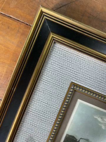 Moldura dourada/preto com 2 paspatur, sendo 1 deles papel de parede texturizado e friso de bolinhas, com vidro liso incolor