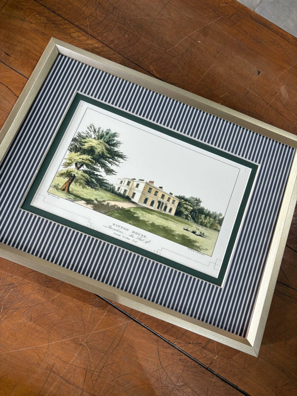 Moldura prata com 2 paspatur, sendo 1 deles listrado verde, com vidro liso incolor