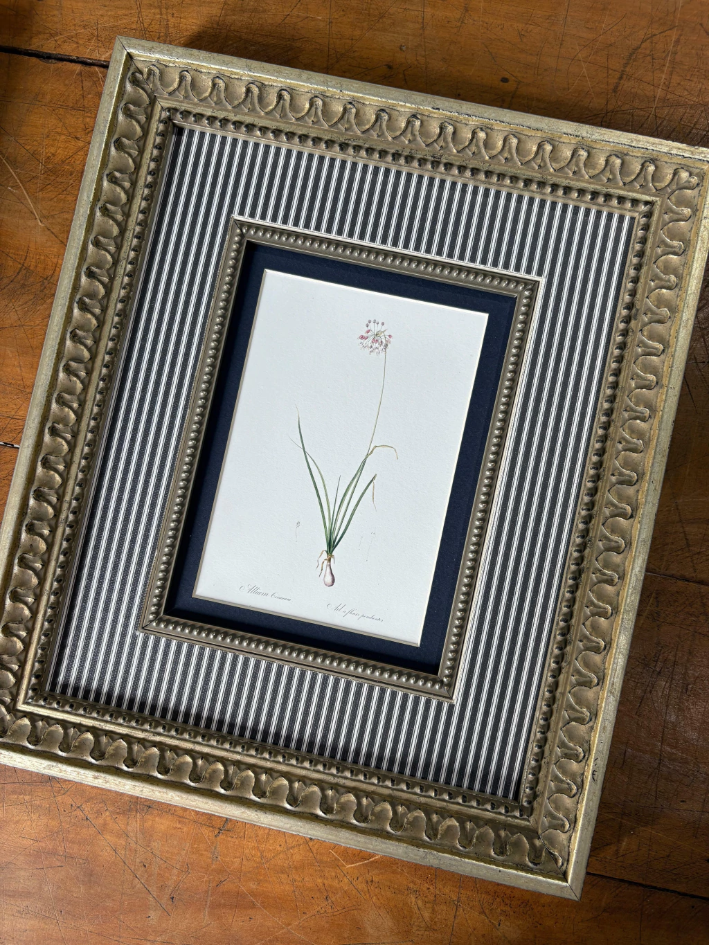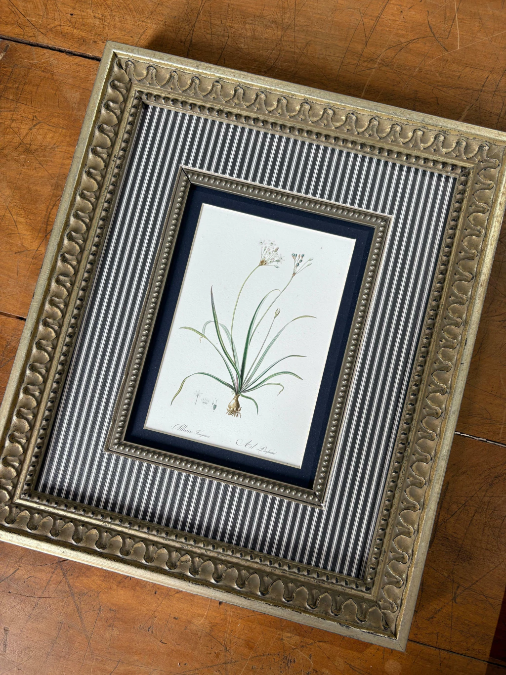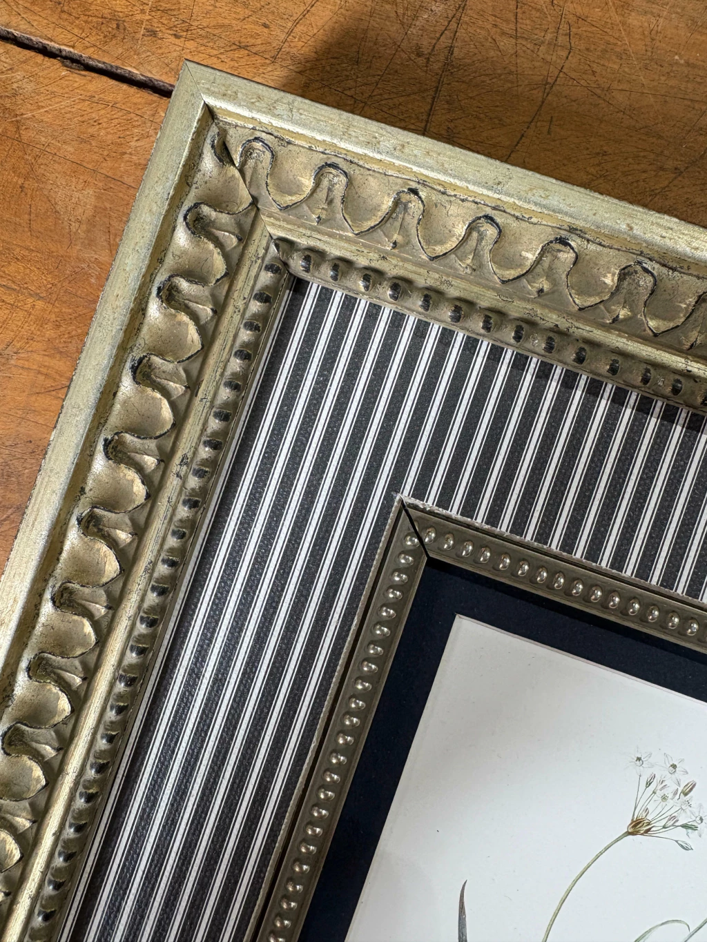 Moldura trabalhada prata envelhecida com 2 paspatur, sendo 1 deles listrado azul e friso de bolinhas, com vidro liso incolor