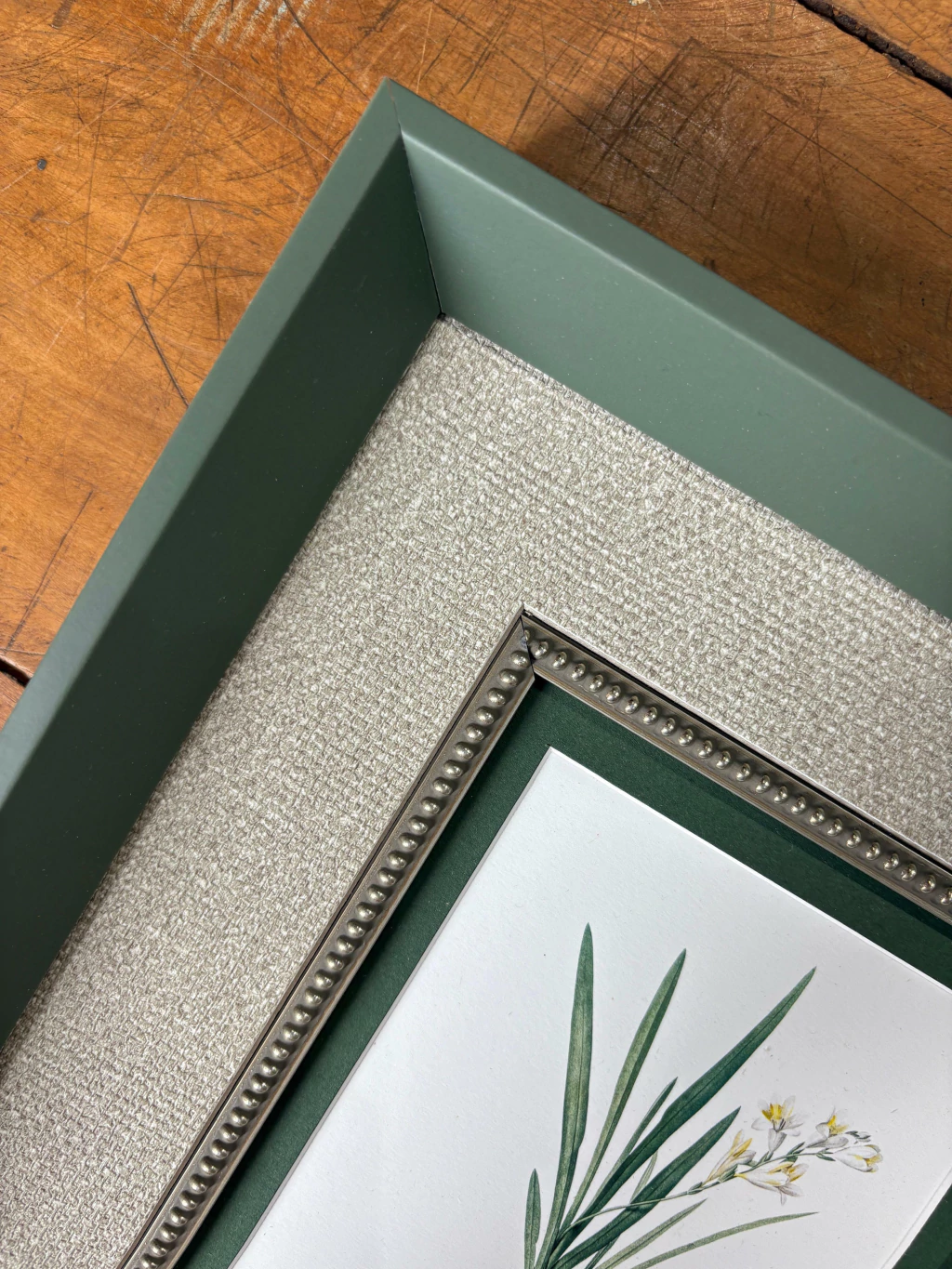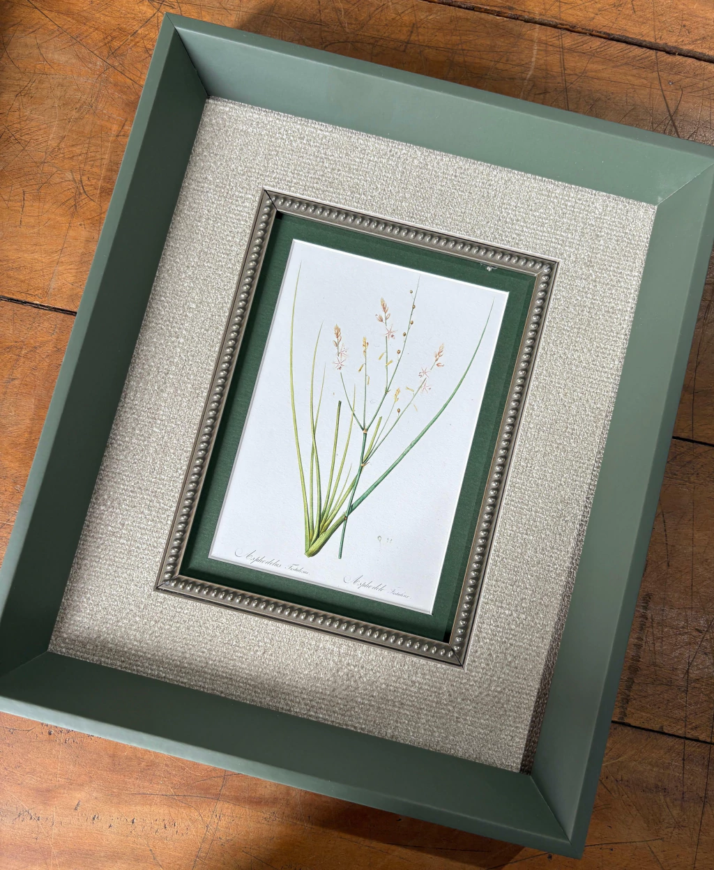 Moldura chanfrada verde com 2 paspatur, sendo 1 deles papel de parede texturizado e friso de bolinhas, com vidro liso incolor
