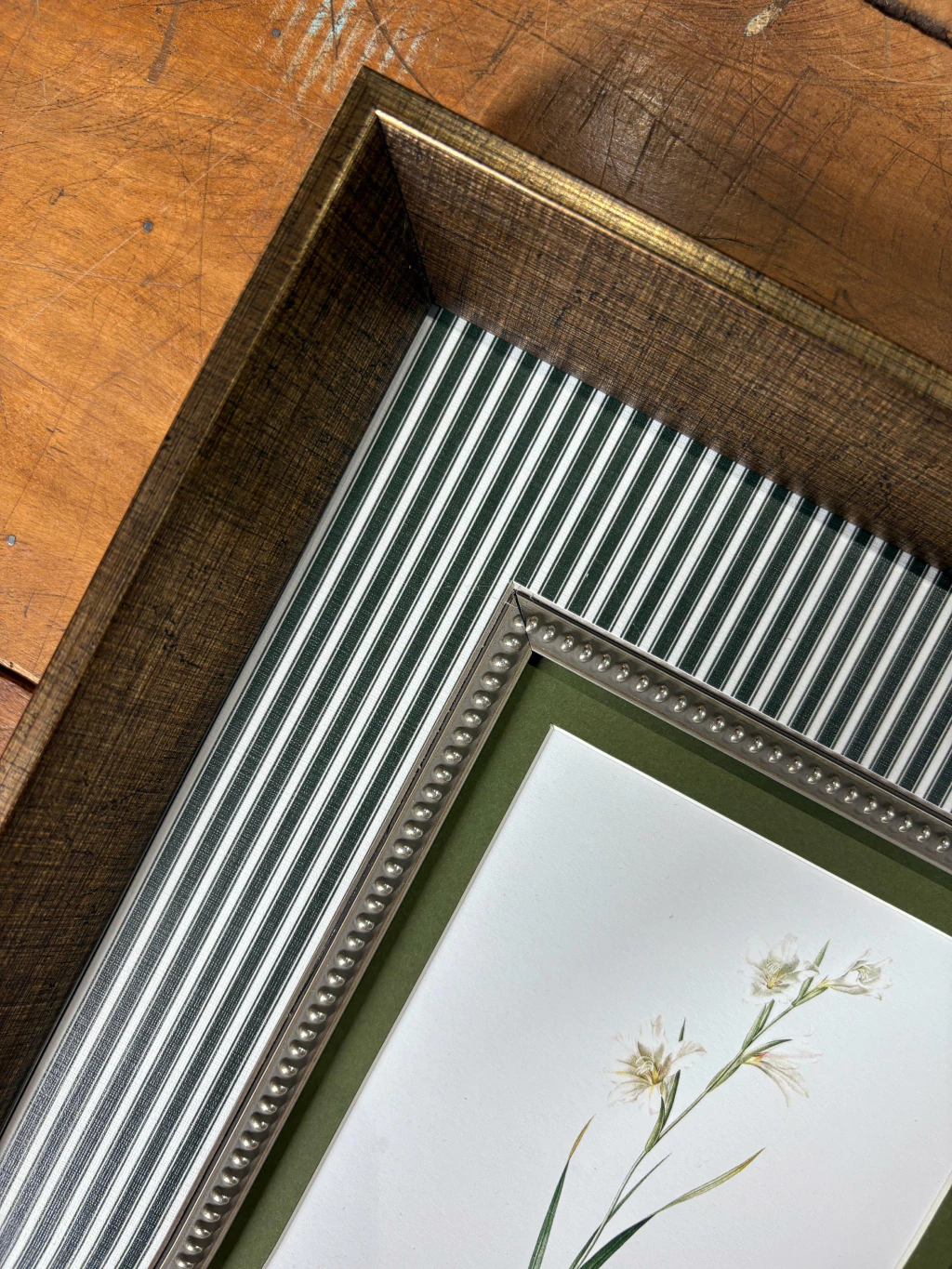 Moldura chanfrada bronze com 2 paspatur, sendo 1 deles listrado verde e friso de bolinhas, com vidro liso incolor