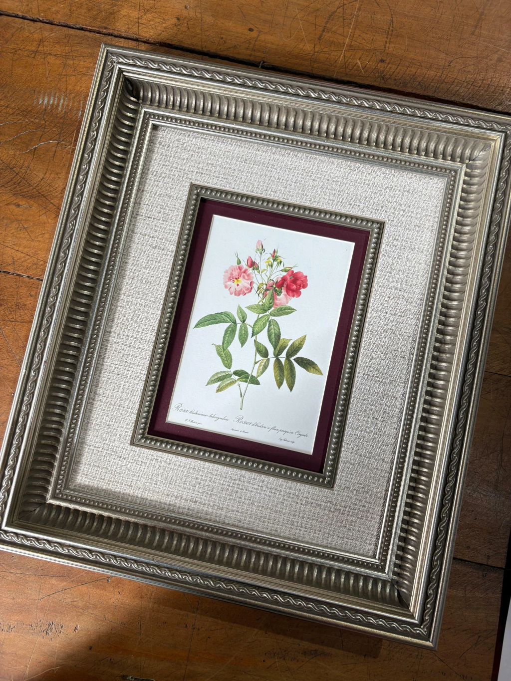 Moldura trabalhada prata envelhecida com 2 paspatur, sendo 1 deles papel de parede texturizado e friso de bolinhas, com vidro liso incolor