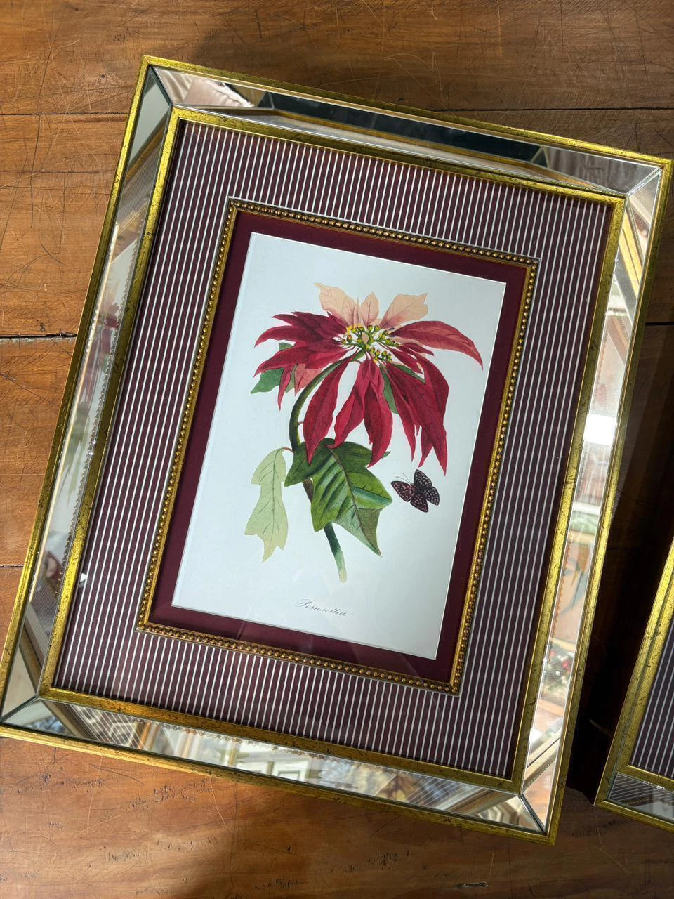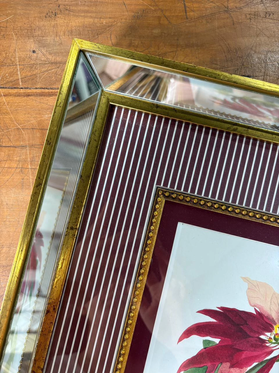 02 quadros impressão fine art com paspatur listrado, friso de bolinhas, moldura revestida em espelho dourada e vidro comum 44x54 cada