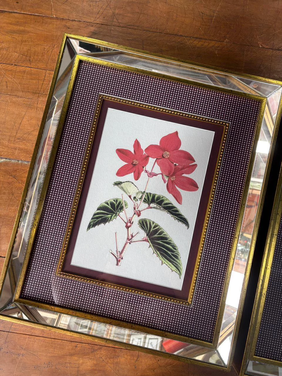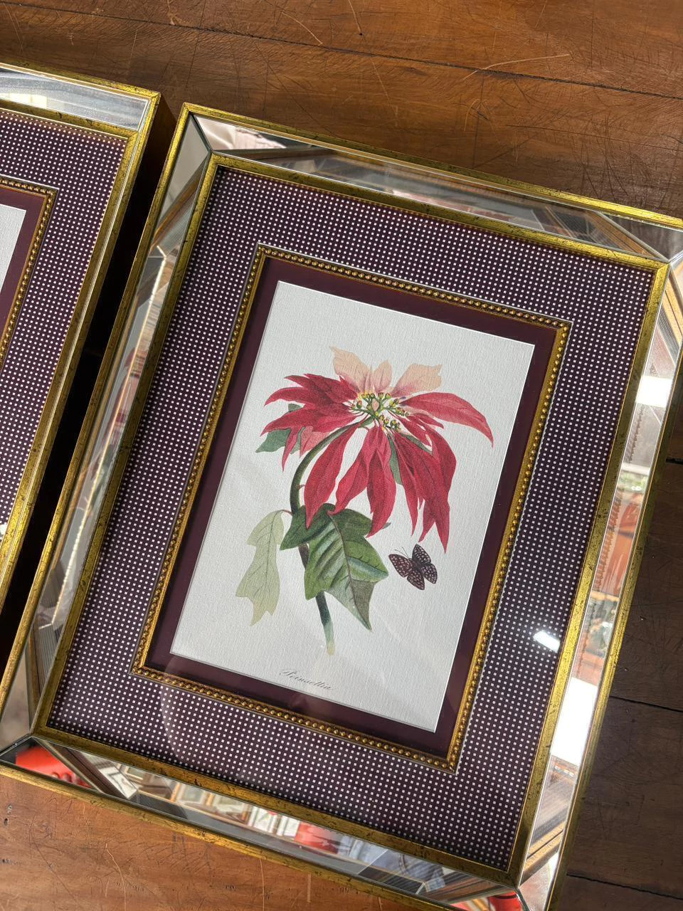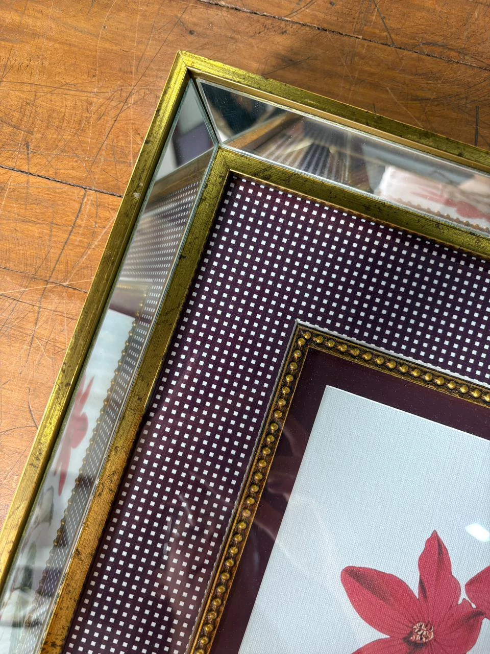 02 quadros impressão fine art com paspatur xadrez, friso de bolinhas, moldura revestida em espelho dourada e vidro comum 44x54 cada